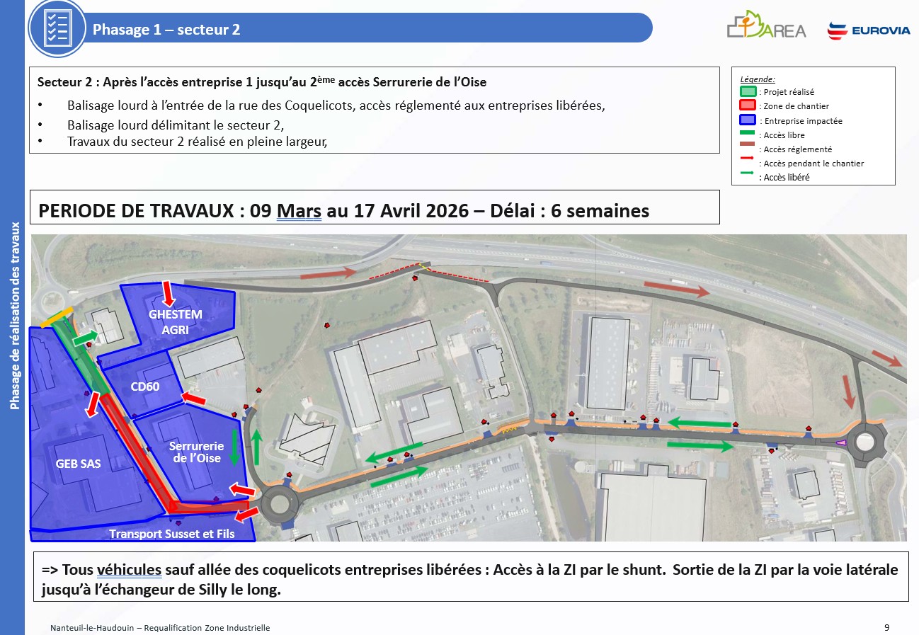 Démarrage des travaux sur le secteur 2 pour une durée de 6 semaines. Pas de modification pour les accès dans la zone pour l'ensemble des entreprises sauf pour l'entreprise GEB qui peut désormais accéder par la rue des coquelicots