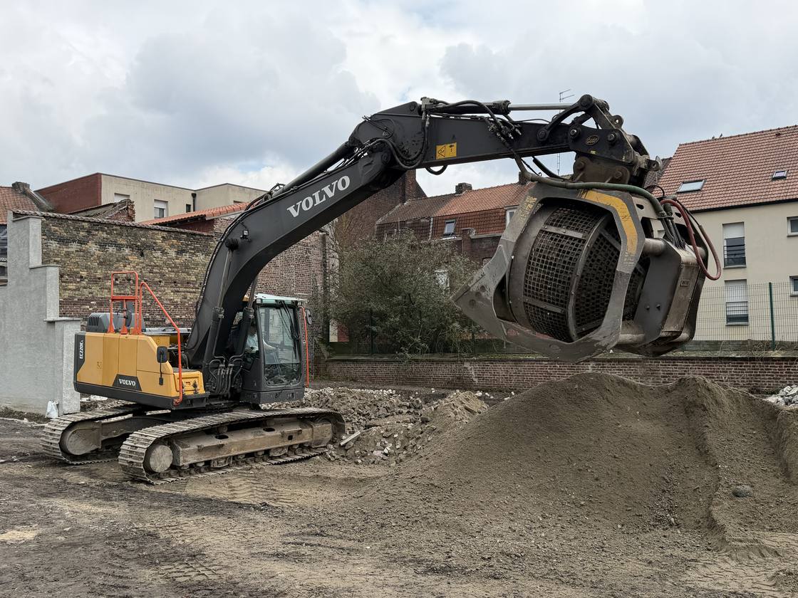 Sur ce chantier, l’opération est effectuée à l’aide d’un godet cribleur, un équipement monté sur engin mécanique permettant un traitement rapide et efficace.