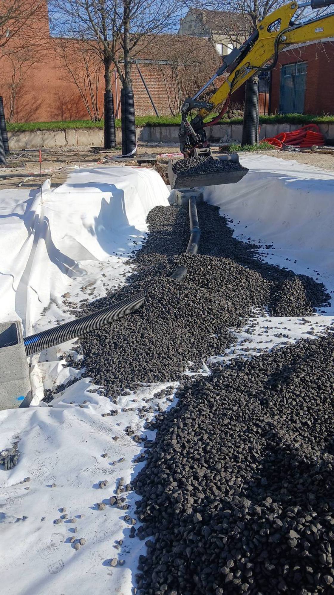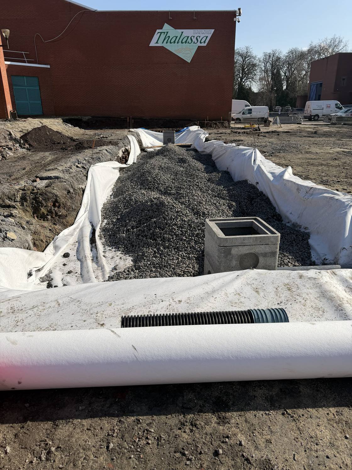 Les travaux ont commencé sur la zone prévue pour les bassins de gestion des eaux pluviales. Ces bassins permettront de limiter les risques de ruissellement et de débordements dans le quartier. Actuellement, les équipes réalisent les premiers travaux techniques : Terrassement progressif du terrain, Mise en place de couches drainantes et préparation pour les futurs matériaux (géotextiles, drains…). Ces interventions garantissent que le bassin fonctionnera efficacement une fois en service, en facilitant l’infiltration et l’évacuation des eaux.